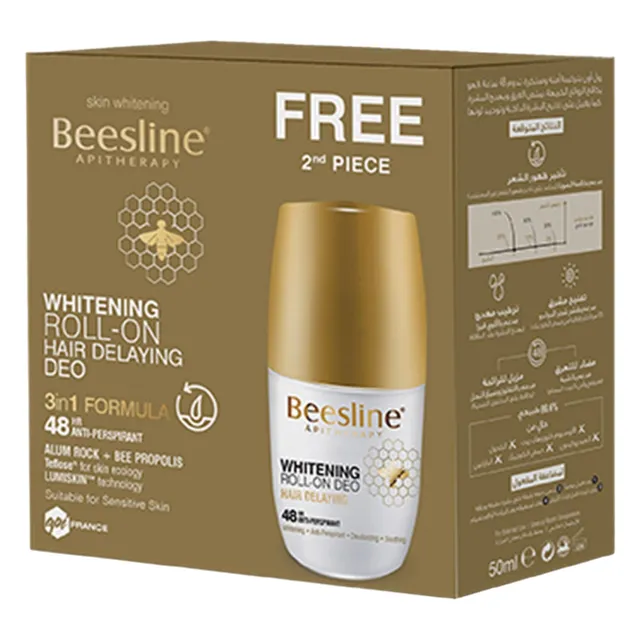 Beesline Whitening Roll-On Hair Delaying Deodorant هو مزيل عرق طبيعي وآمن يوفر حماية لمدة 48 ساعة ويساعد على تفتيح منطقة تحت الإبطين وتأخير نمو الشعر مع الاستخدام المنتظم