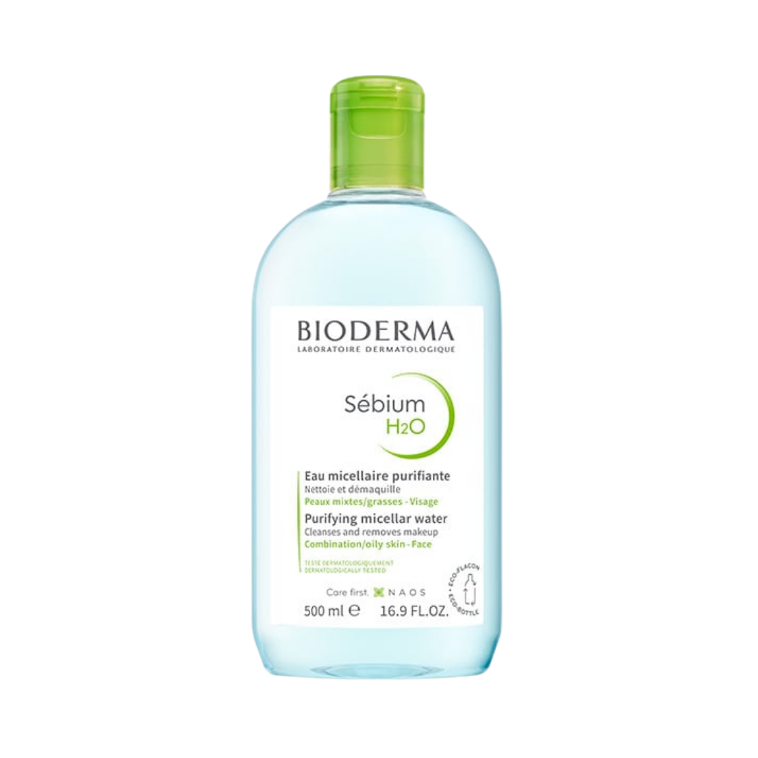 Bioderma Sébium H2O ماء ميسيلار مطهرًا ومصممًا خصيصًا لتنظيف البشرة المختلطة إلى الدهنية والمعرضة لحب الشباب، حيث يزيل المكياج والشوائب والدهون الزائدة دون التسبب في جفاف الجلد.