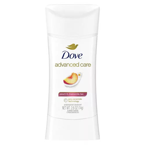 Dove Advanced Care Peach & Chamomile Tea Antiperspirant Stick بحجم 74 جم منتجاً للعناية الفائقة بمنطقة تحت الإبط، يوفر حماية طويلة الأمد ويساعد على إصلاح حاجز البشرة بفضل تقنية برو سيراميد (Pro-Ceramide Technology).