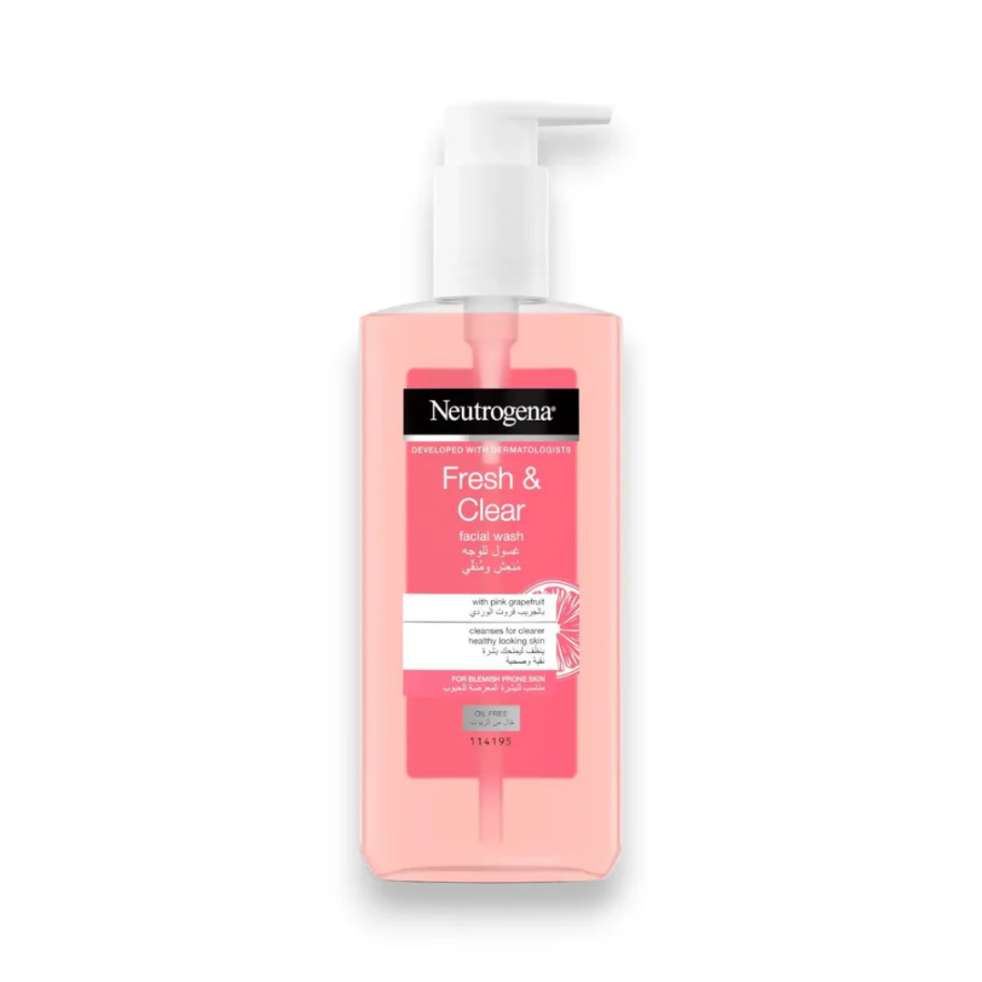 Neutrogena Fresh & Clear Pink Grapefruit Facial Wash (بحجم 200 مل) منظفاً يومياً منعشاً مصمماً خصيصاً للبشرة المعرضة للشوائب والحبوب، حيث يعمل على تنظيف المسام بعمق مع الحفاظ على نضارة البشرة.